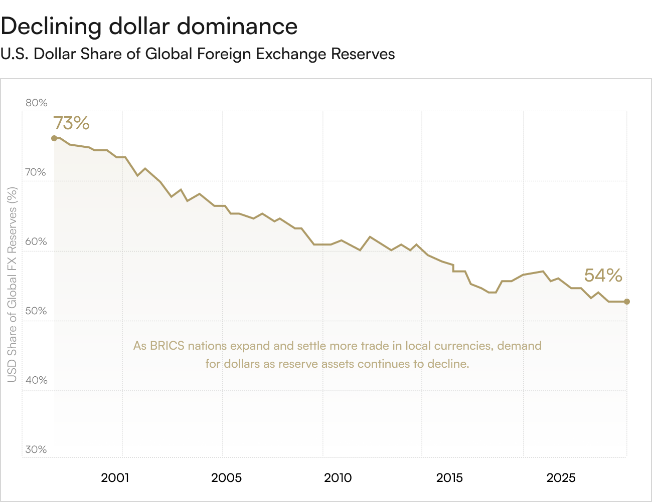 The most significant shift in global monetary architecture since the Bretton Woods system is happening right now, and most American retirement investors are completely unaware of it. Russia and China have effectively decoupled from the U.S. dollar, settling approximately 90% of their bilateral trade in rubles and yuan. The BRICS bloc, which now represents nearly 40% of global GDP measured by purchasing power parity, is systematically constructing alternative payment infrastructure through systems like mBridge and BRICS Pay that bypass dollar intermediation entirely. The dollar's share of global foreign exchange reserves has fallen from 73% in 2001 to approximately 54% in 2025, and this decline is accelerating. For retirement portfolios denominated in dollars, the implications are profound: the currency you are saving in is losing its privileged status as the world's reserve asset, and gold is emerging as the ultimate beneficiary.