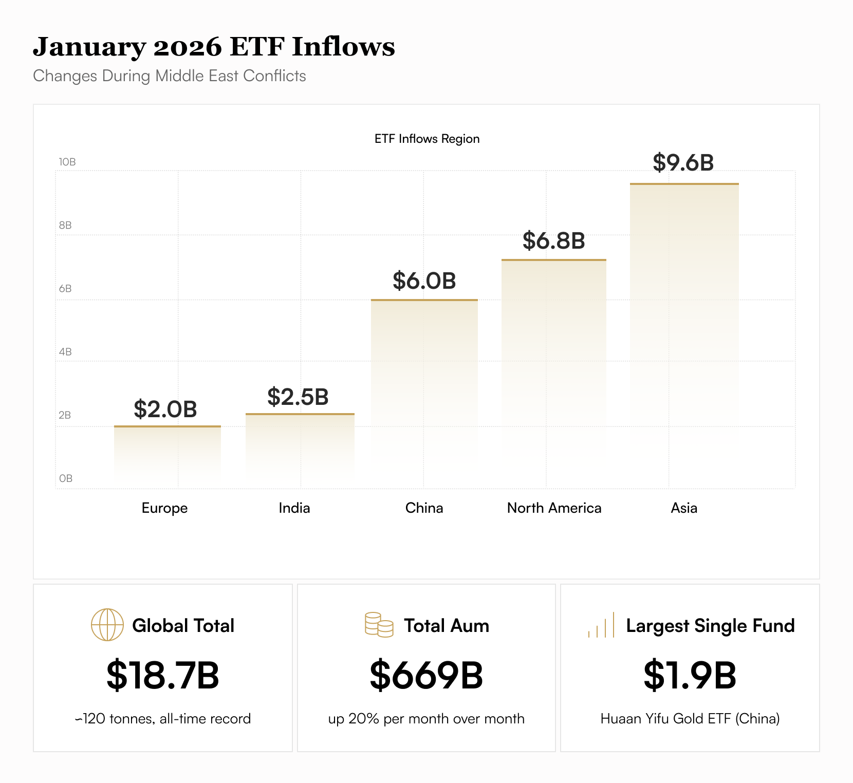 In January 2026, global gold ETFs attracted $18.7 billion in net inflows (approximately 120 tonnes), the strongest single month intake ever recorded, according to the World Gold Council. Total assets under management surged to $669 billion, up 20% in a single month. The most striking detail: Asia accounted for 51% of all global inflows at $9.6 billion, with China alone contributing $6 billion, signaling a historic shift in who is buying gold and why.