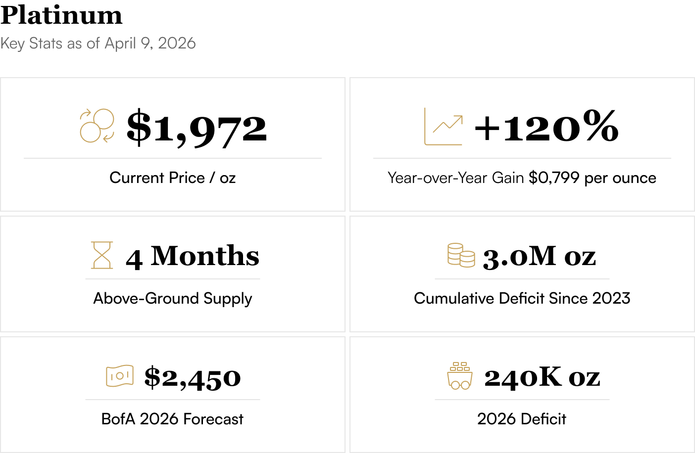 While gold dominates headlines, platinum and palladium are staging a breakout that most investors have completely missed. Platinum touched $2,173.50 per ounce on March 4 and trades near $1,972 as of April 9, representing a gain of over 120% since early 2025. Palladium hit $1,516.20 on April 7, surging 3% in a single session. The World Platinum Investment Council (WPIC) projects a fourth consecutive year of deficit in 2026 at 240,000 ounces, with cumulative shortfalls since 2023 approaching 3 million ounces.