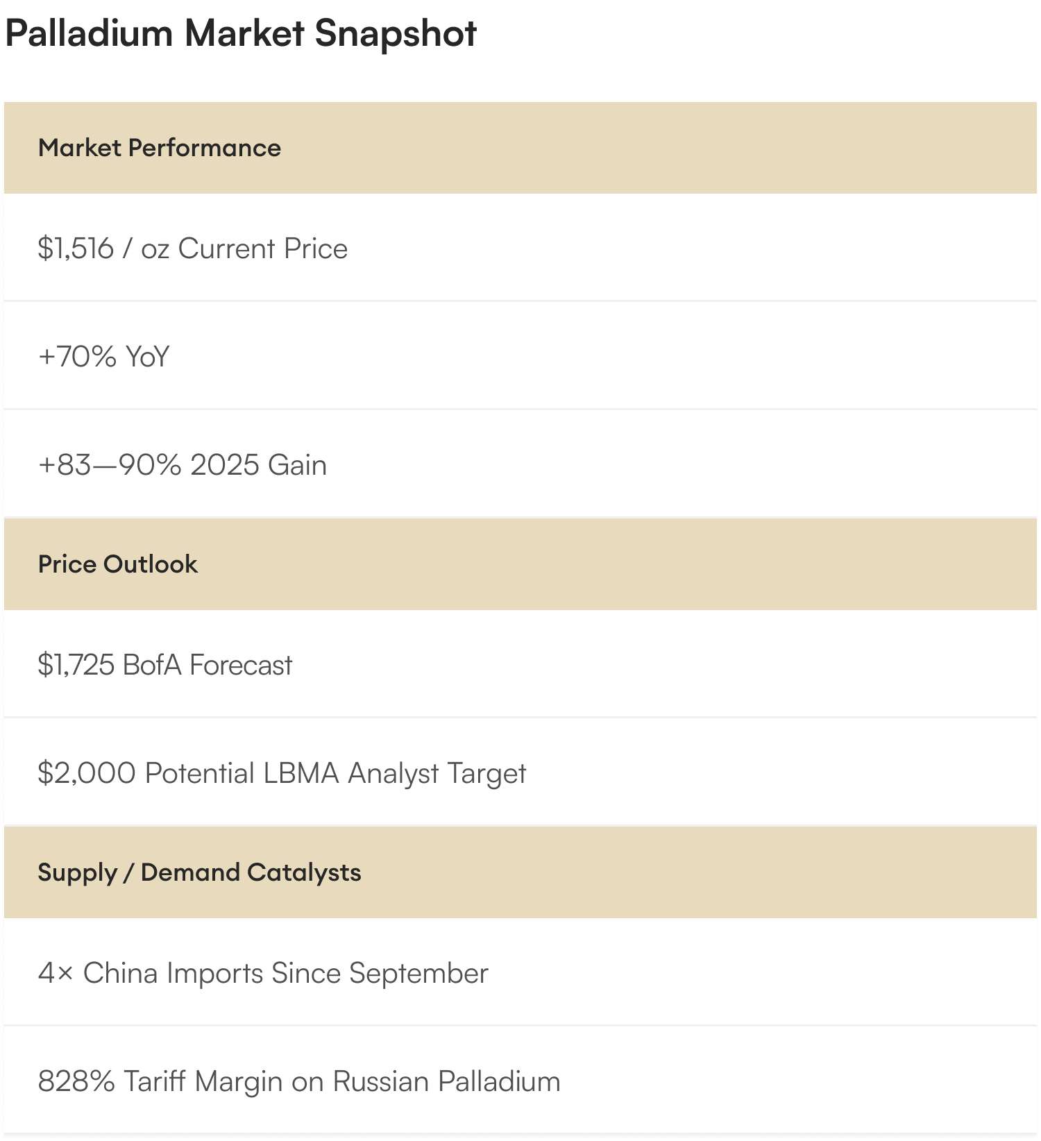 - Aberdeen Investments: "Palladium has the potential to continue higher based on a rollback of the EV transition in the US."