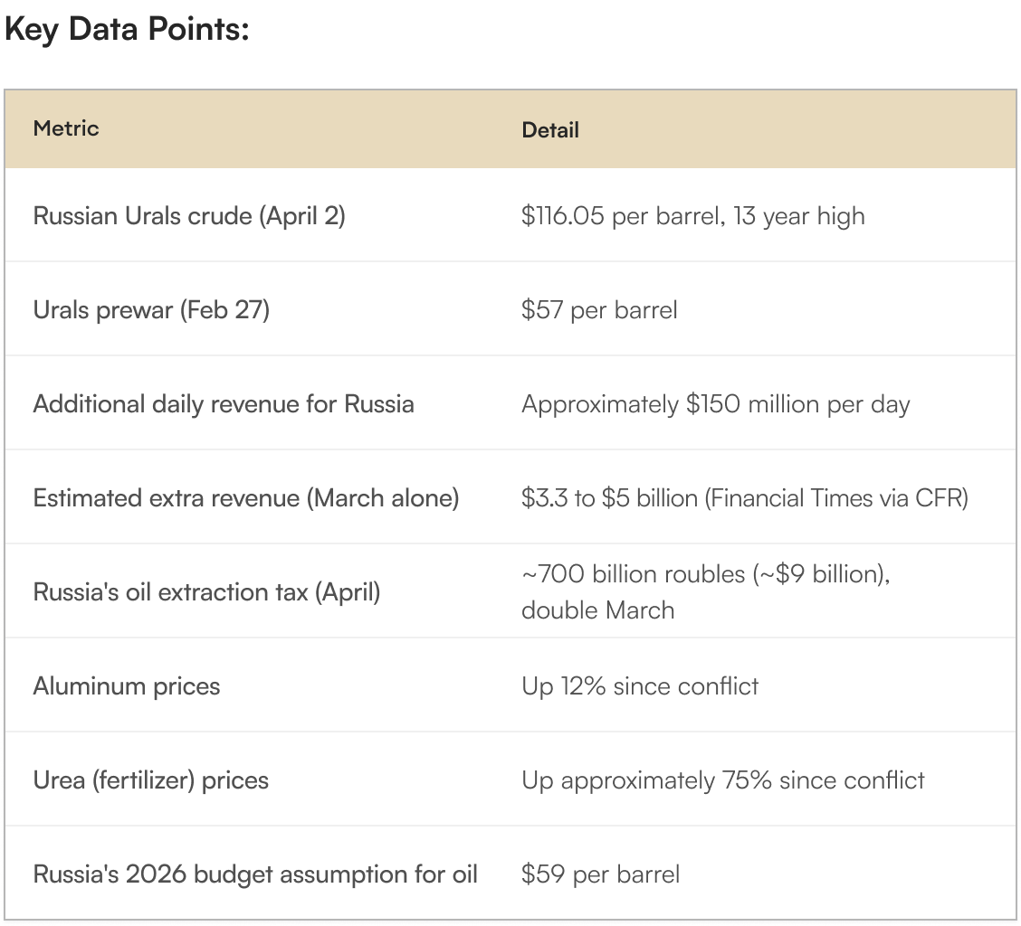 While the United States spends billions prosecuting the Iran war, Russia is quietly pocketing the largest oil windfall in over a decade. Russian Urals crude hit $116.05 per barrel on April 2 at the Primorsk port, a 13 year high, according to Argus Media data reported by Bloomberg. Russia's mineral extraction tax on oil is set to double to approximately 700 billion roubles ($9 billion) in April alone, up from 327 billion roubles in March.