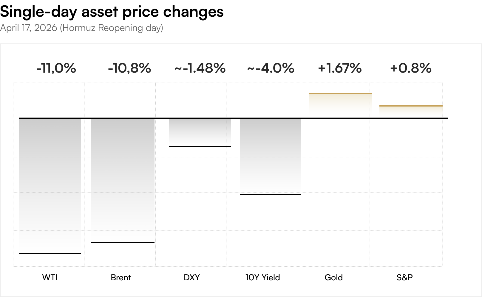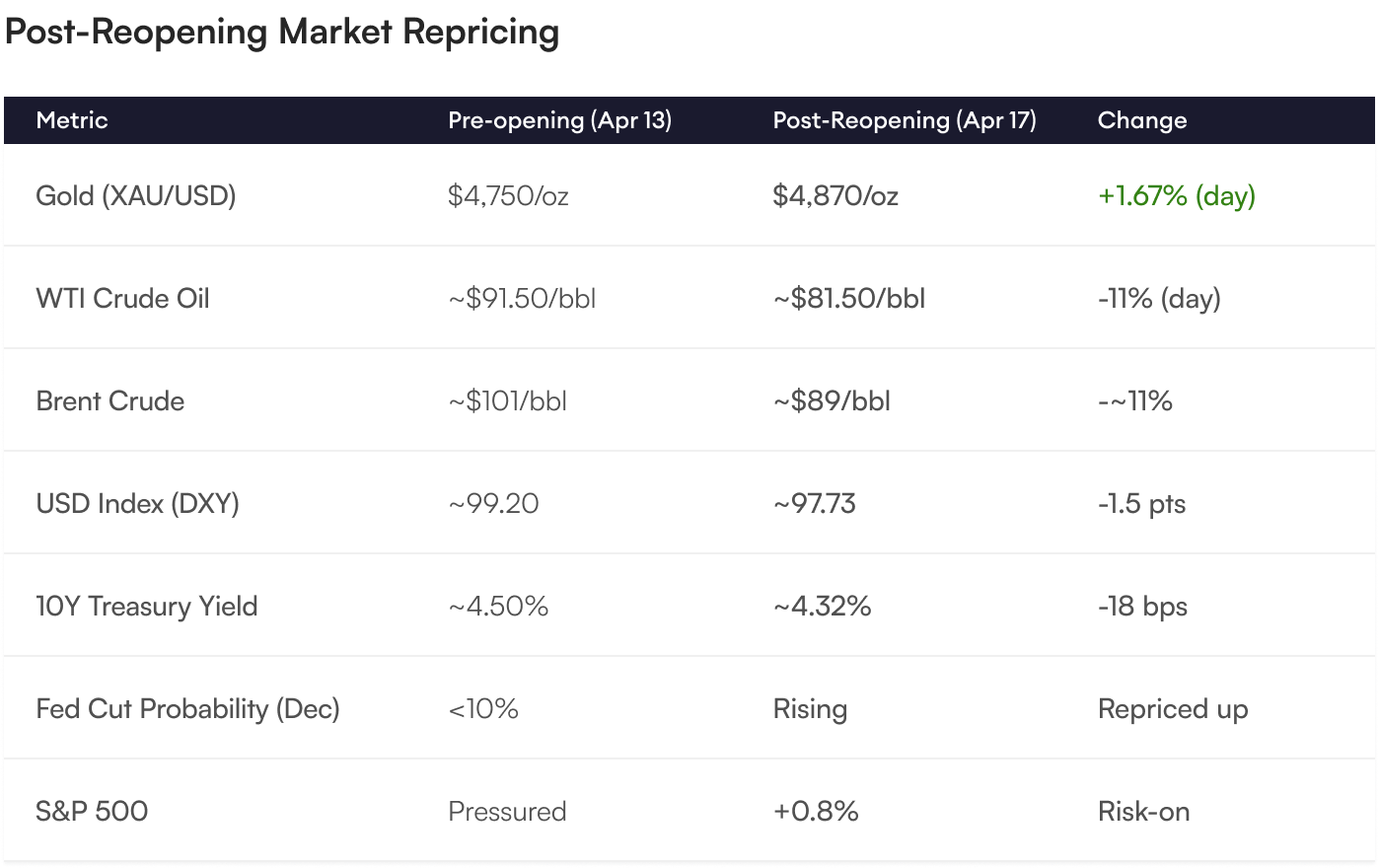 The market reaction to Iran's reopening announcement was swift, decisive, and instructive. Oil prices fell more than 11% intraday, the sharpest single-day collapse in crude in months. The dollar weakened, bond yields fell, Fed rate cut expectations were immediately repriced higher, and equity markets rallied. Gold, rather than falling on the perceived reduction in geopolitical risk, rose.