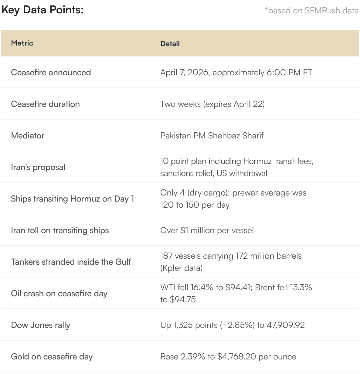 On April 7 at approximately 6:00 PM ET, just two hours before his own deadline to destroy "a whole civilization," President Trump announced a two week ceasefire with Iran. The deal, brokered by Pakistan, accepted Iran's 10 point proposal as "a workable basis on which to negotiate." By April 8, Iran's Supreme National Security Council confirmed acceptance. VP JD Vance departed for Islamabad to lead peace talks beginning April 10. The ceasefire expires April 22, and cracks appeared almost immediately.