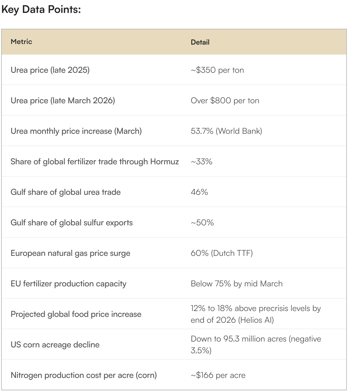 While oil prices dominate headlines, a fertilizer crisis of historic proportions is silently building. Urea prices have surged from approximately $350 per ton in late 2025 to over $800 per ton, more than doubling. The World Bank's April 2026 commodity report showed a 26.2% fertilizer price spike in a single month. Approximately one third of global seaborne fertilizer trade passes through the Strait of Hormuz, Cand Gulf countries produce 46% of global urea trade, roughly 20% of phosphate fertilizers, and approximately 25% of global sulfur. Unlike oil, no strategic fertilizer reserves exist anywhere in the world.